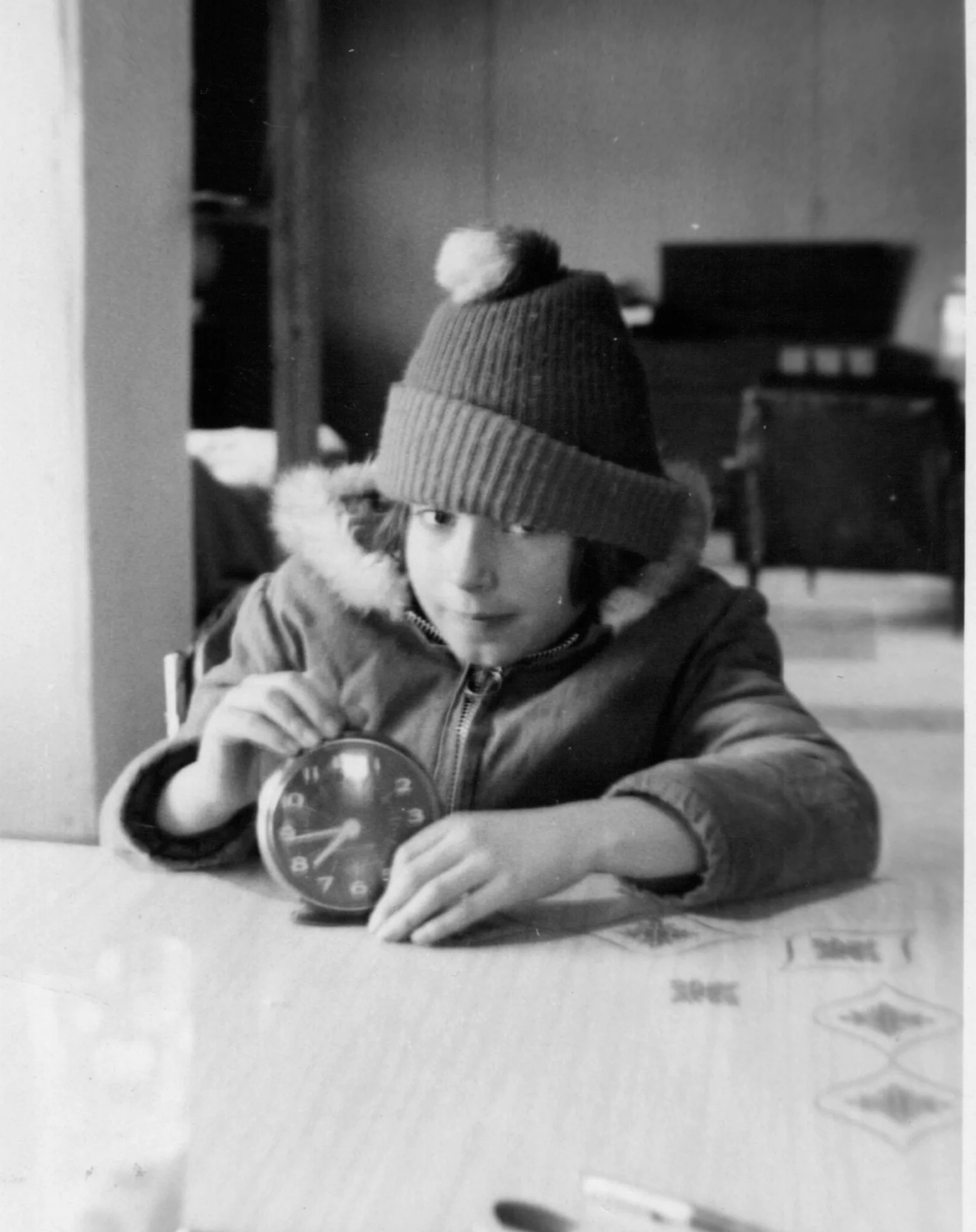 J’ai installé l’appareil photo sur une surface stable et utilisé le retardateur. Le mot selfie n’existait pas encore, mais le geste, lui, était déjà bien présent. J’ai pris place à la table de la cuisine, emmitouflé dans mon manteau et ma tuque, un cadran posé devant moi. L’image devait traduire cette attente précise : être prêt à partir, guetter l’heure, surveiller le temps qui passe.