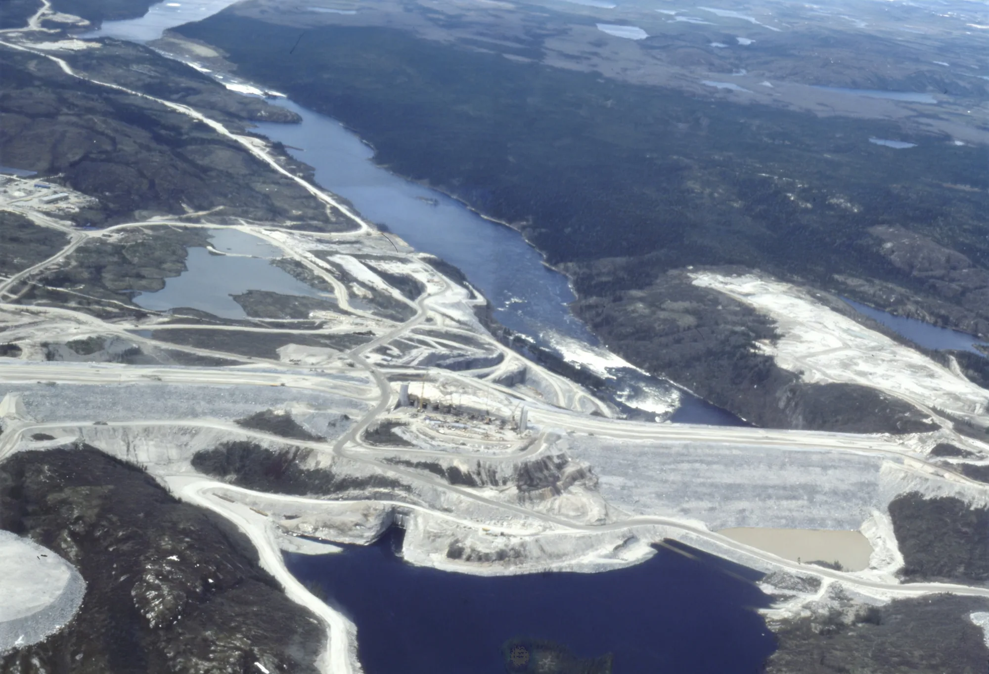 Au premier plan, légèrement vers la gauche, on distingue l’entrée du canal de dérivation. Pendant la construction, c’est par ce canal que l’eau était détournée afin de libérer la zone de travail. En aval, le remous est visible dans la rivière La Grande, à la sortie du canal, marquant physiquement cette circulation temporaire imposée au cours d’eau.